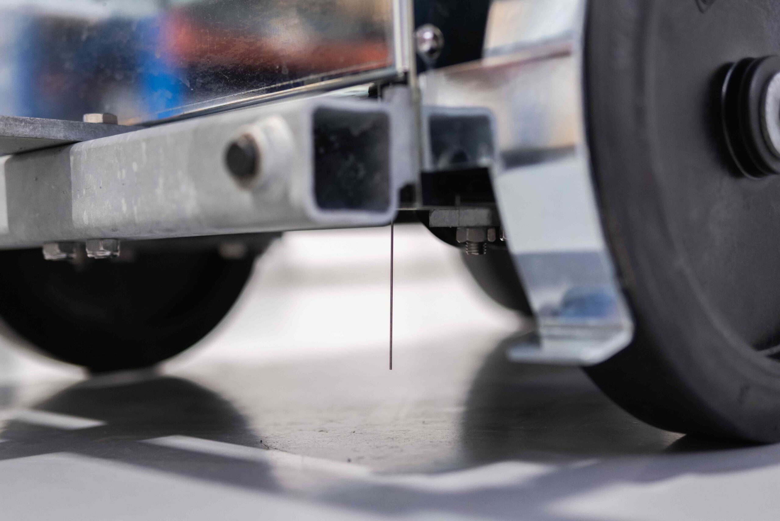 Le robot avance et recule de façon autonome en suivant le rail métallique lui servant de guidage. Grâce à un repère mécanique, il sait toujours se situer. La distance de déplacement est réglée directement dans le programme afin de s’adapter à la taille des caisses. Ce système garantit une précision constante, un cycle de lavage fluide et un minimum d’intervention humaine.